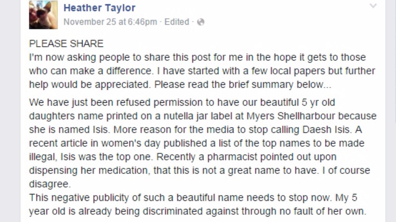 Nutella rejects personalised jar for Shellharbour girl named Isis Myer told Ms Taylor that Nutella had a protocol for acceptable names and directed her to Nutella's parent company, Ferrero Australia. Nutella said the personalised labels were intended to be a ...